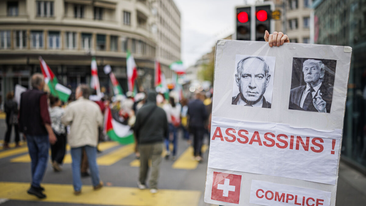 Auf einem Schild wurden US-Präsident Donald Trump und der israelische Ministerpräsident Benjamin Netanjahu als Mörder bezeichnet - und die Schweiz als Komplizin.