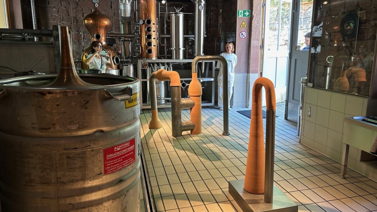 Weiniger heisst aber nicht keine: Auch in der Kleinbasler Altstadt gibt es solche Orte. Zum Beispiel im Hinterhof an der Clarastrasse 11, wo sich unter einem grossen Baum eine kleine Spirituosen-Brennerei verbirgt. Die mexikanische Künstlerin Ximena Garrido-Lecca hat ein Röhrensystem aus Keramik- und Stahlelementen geschaffen, das wie eine hübsch-ironische und ins Nichts führende Spiegelung des Brenner-Systems anmutet.