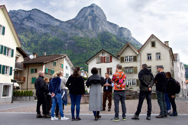 So viel Geschichte an ebenso vielen Standorten in einen einzigen Tag zu verpacken, bedingt einer minutiösen Organisation, einer rigiden Führung und der Disziplin aller Beteiligten. Erster Halt: der Dorfplatz in Mels.