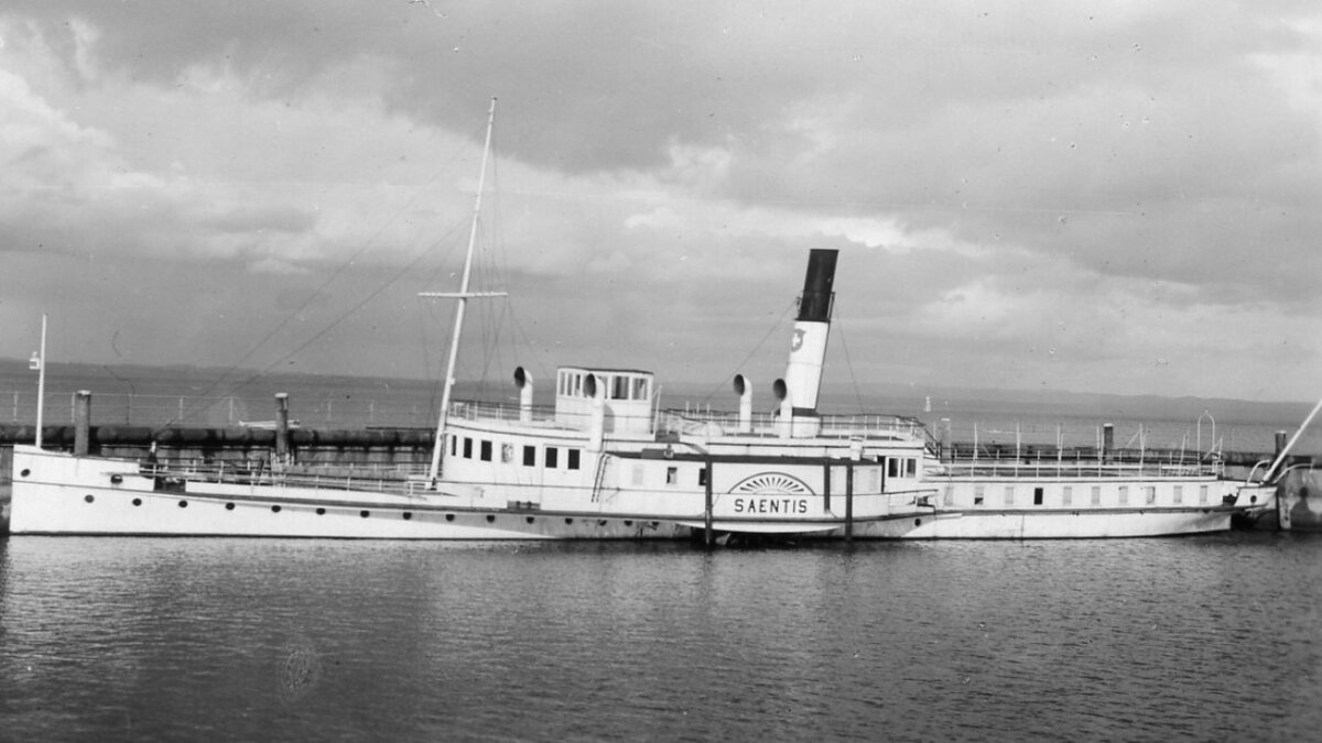 Die "Säntis" wurde im Mai 1933 versenkt, weil sie nicht mehr fahrtauglich war. Sie liegt in der Seemitte zwischen Romanshorn und Langenargen (D). Eine Verschrottung wurde damals als zu teuer verworfen. Das 49 Meter lange Schiff war seit 1892 auf dem Bodensee unterwegs und konnte 400 Passagiere befördern.