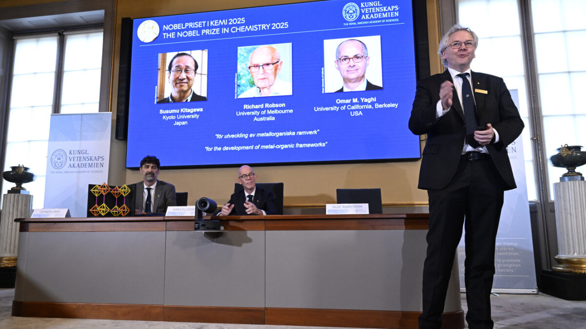 Der Nobelpreis für Chemie geht in diesem Jahr an Susumu Kitagawa (Japan), Richard Robson (Australien) und Omar Yaghi (USA) für die Entwicklung metallorganischer Gerüstverbindungen. Das teilte die Königlich-Schwedische Akademie der Wissenschaften in Stockholm mit.