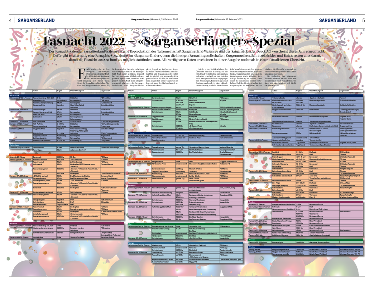 Der Fasnachtskalender Sarganserland-Walensee – eine Koproduktion der Talgemeinschaft Sarganserland-Walensee und der Sarganserländer Druck AG – erscheint dieses Jahr erneut nicht. Dafür gibt es alternativ eine Fasnachts-Spezialseite im «Sarganserländer», denn die hiesigen Fasnachtsgesellschaften, Guggenmusiken, Schnitzelbänkler und Butzis setzen alles daran, damit die Fasnacht 2022 so bunt als möglich stattfinden kann. Alle verfügbaren Daten erscheinen in dieser Ausgabe nochmals in einer aktualisierten Übersicht.