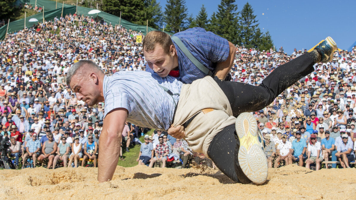 Am Eidgenössischen Jubiläumsschwingfest in Appenzell kommt es am Sonntag im ersten Gang zum Aufeinandertreffen zwischen Unspunnen-Sieger Samuel Giger und Schwingerkönig Joel Wicki.