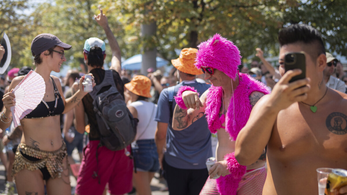 Heiss war den Besucherinnen und Besuchern auch schon, bevor sie sich bewegten. 34 Grad herrschten am Nachmittag am Zürcher Seebecken. Beim Tanzen in der Menschenmenge wurde es dann noch wärmer. Rasch gesellten sich Schweissperlen zu Glitzersteinchen und Bodypainting.