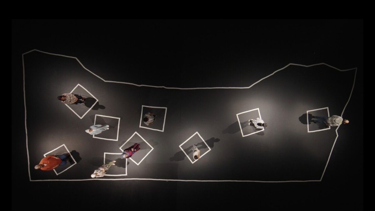 An welchem Ort jemand seine oder ihre Geschichte erzählt, spielt eine untergeordnete Rolle. Es ist eine Tatsache, die "Qui vit encore" insofern verdeutlicht, als der Film diese Erzählungen in einem schwarzen Raum stattfinden lässt. Es gibt weder Hintergrund noch Geräuschkulisse. Einzig die Umrisse von Gaza sind mit weisser Kreide auf den Boden gezeichnet. Die jeweils erzählende Person sitzt an einem Tisch.