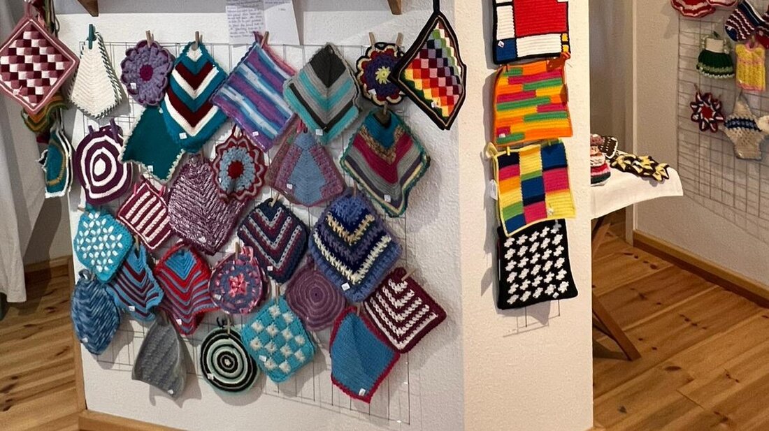 Küchenhelfer aus Luftmaschen, festen Maschen und einer Kettmasche aus Mels finden ihren Weg in eine Galerie in Ostdeutschland: Topflappen von Annemarie Ackermann, St. Martin, sind noch bis am Samstag,…