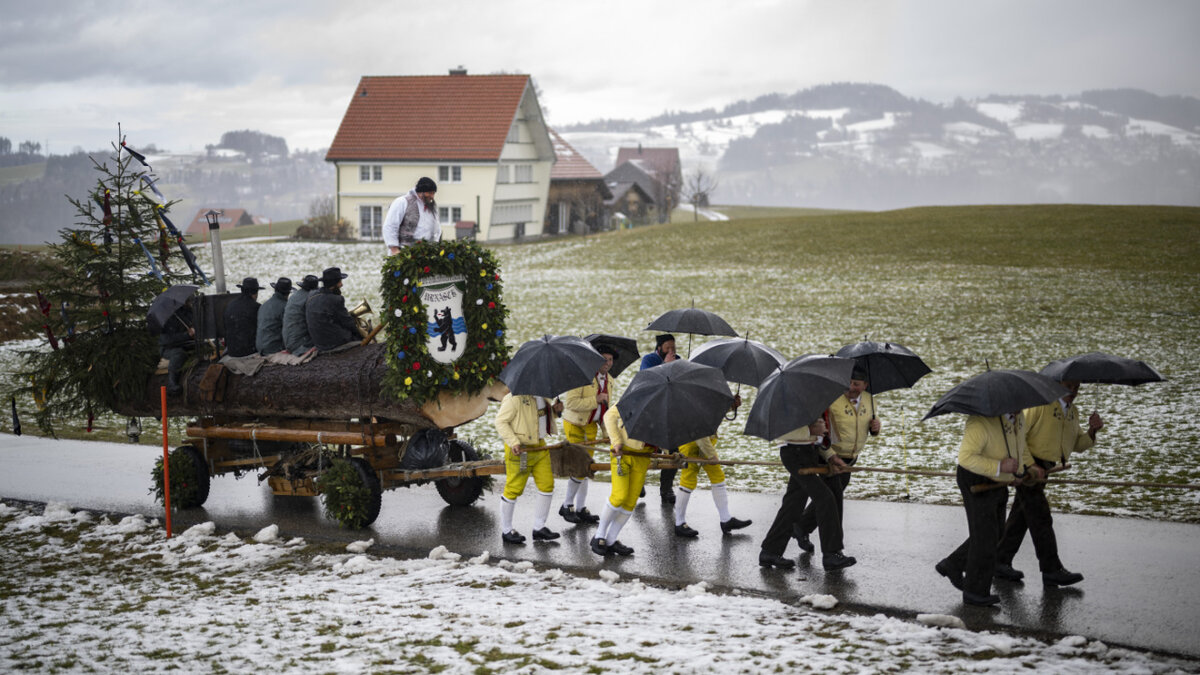 Mehrere Männer haben am Montag einen Baumstamm durch das Appenzeller Hinterland gezogen. Das Urnäscher Bloch führt jedes zweite Jahr vom gleichnamigen Ort über Hundwil, Stein nach Waldstatt und wieder zurück nach Urnäsch. Erst kürzlich lieferte ein Historiker neue Erkenntnisse zu diesem Brauch.