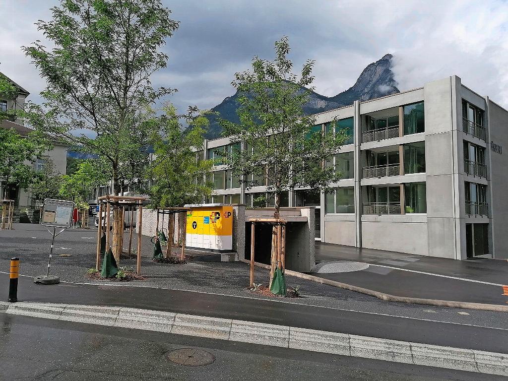 In der Überbauung Stoffel in Mels hat die Schweizerische Post AG einen neuen My-Post-24-Automaten installiert. Er wird mithilfe der Post-App bedient.