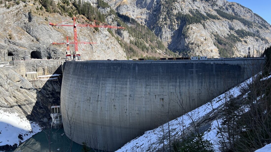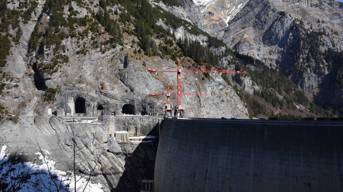 Verschwindend klein im Verhältnis zu Gigerwald-Staumauer: Die höhergelegten Einlaufbauwerke zum Grundablass und zum Triebwasserstollen (unten links). (Bilder: Pressedienst, Hans Bärtsch)