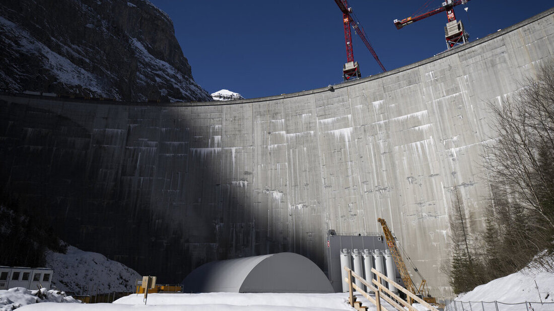 Baustelle am Gigerwald-Stausee von Axpo und Kraftwerke Sarganserland, aufgenommen am Dienstag, 18. Maerz 2025, in Vaettis. Die Axpo entleert den Stausee komplett, um den Grundablass zu sanieren. Die Sanierung kostet 25 Millionen Franken, die Anlage soll im Fruehsommer 2025 wieder in Betrieb gehen. (KEYSTONE/Gian Ehrenzeller)