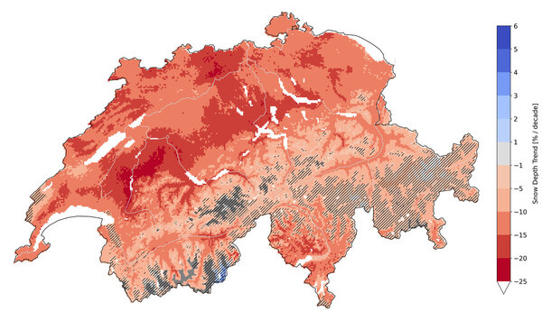 Die Ergebnisse aus dem Modell, das auf Messdaten von 350 Stationen der letzten 25 Jahre basiert, zeigen: Während die absoluten Verluste in den Alpen am höchsten sind, trifft es das ohnehin schneearme Mittelland prozentual am härtesten. Dort beträgt der Rückgang zwar weniger als einen Zentimeter pro Jahrzehnt, doch weil ohnehin kaum Schnee liegt, entspricht das einem Verlust von bis zu 20 Prozent.
