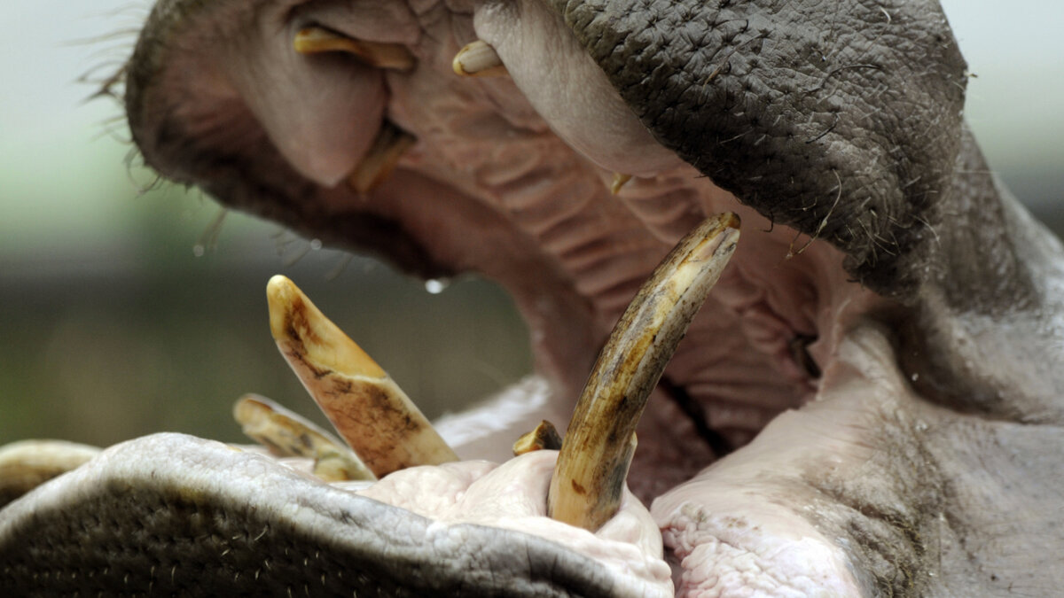 Nilpferde können ausgesprochen aggressiv werden. Die Tiere, die nachts am Seeufer grasen, greifen an, wenn sie ihr Territorium verletzt fühlen.